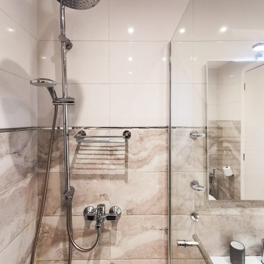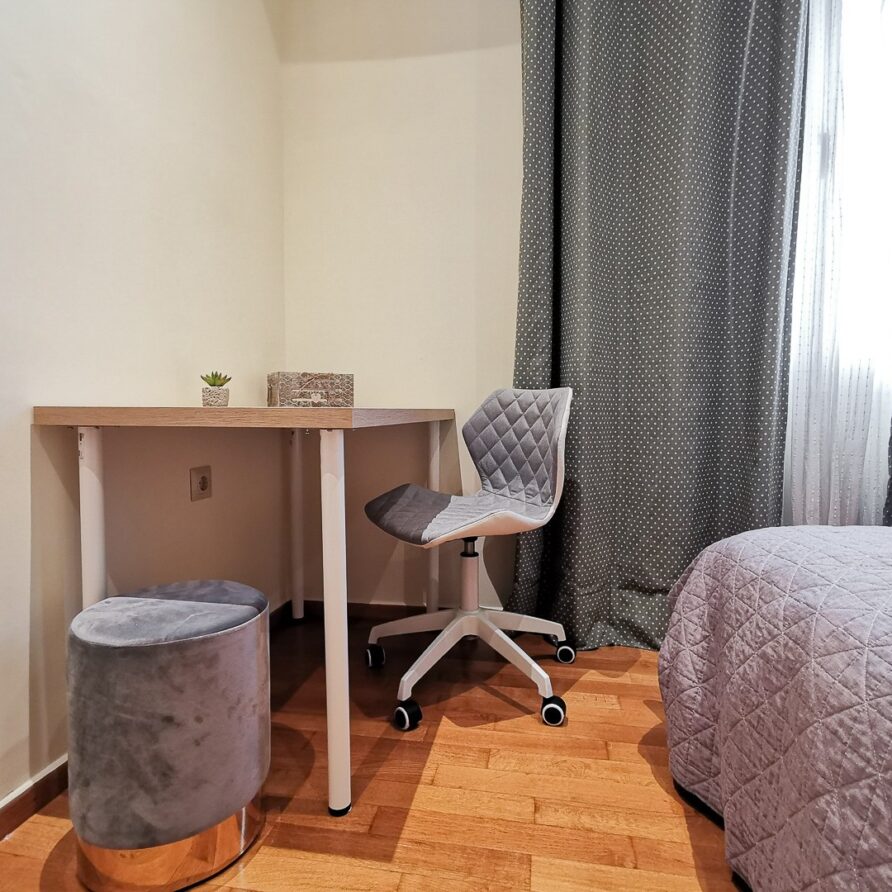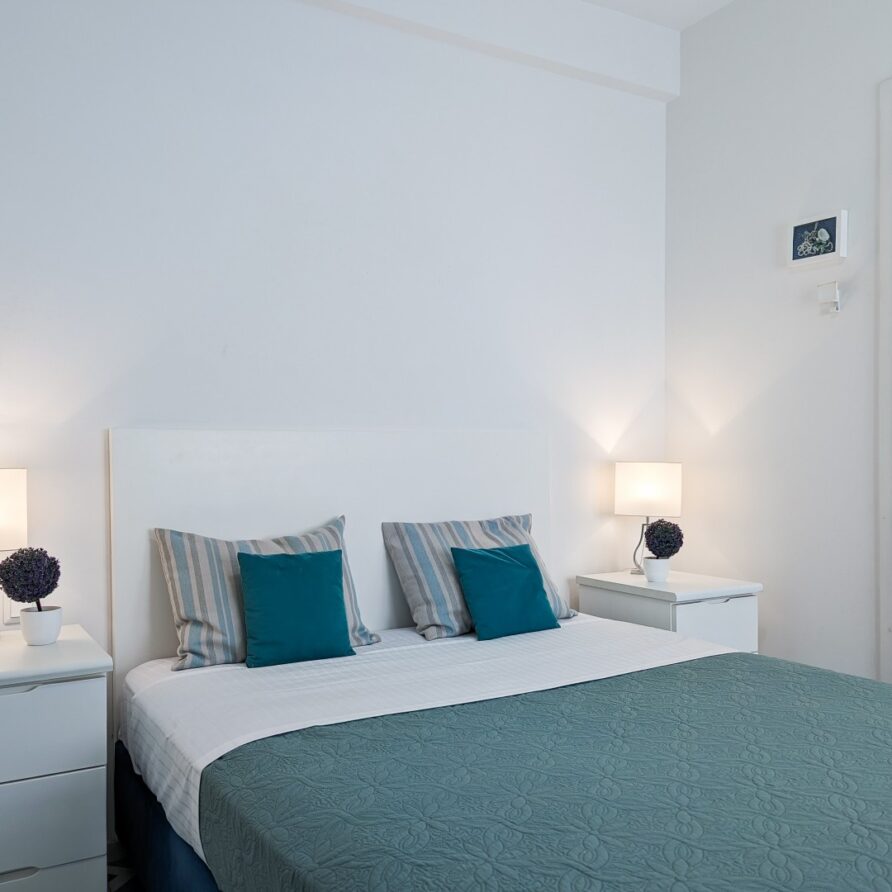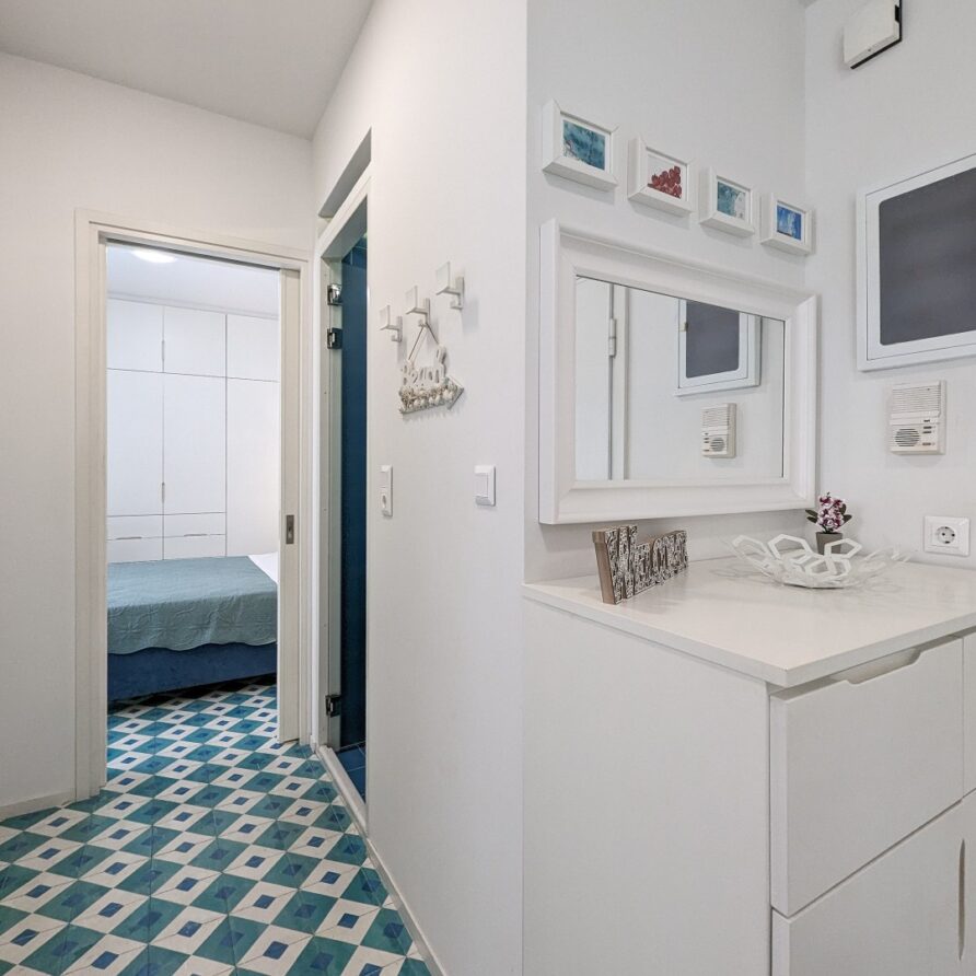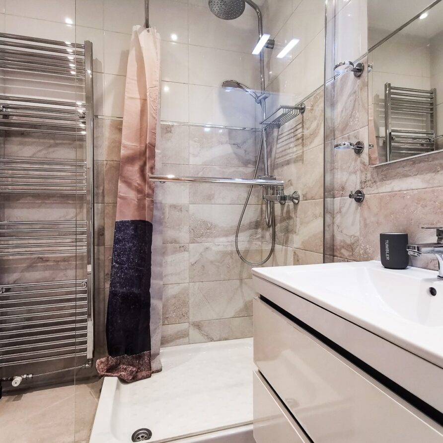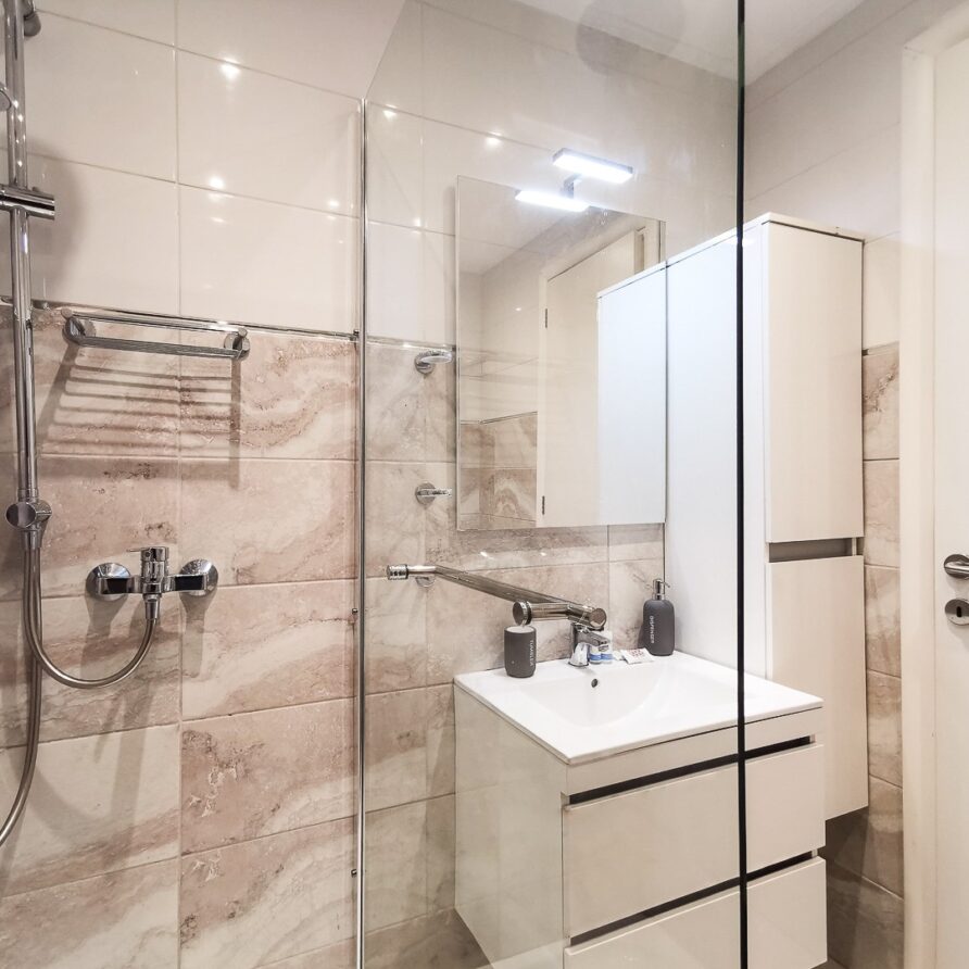 The apartment features 2 bedrooms – one of them is a master bedroom with bathroom (both BD have double sized beds), an open plan living room/dining room/kitchen with fitted electrical appliances, 2 full bathrooms and a balcony where you can enjoy your breakfast. The property has also a reinforced security door, aluminum windows with double glazing and autonomous cooling/heating.