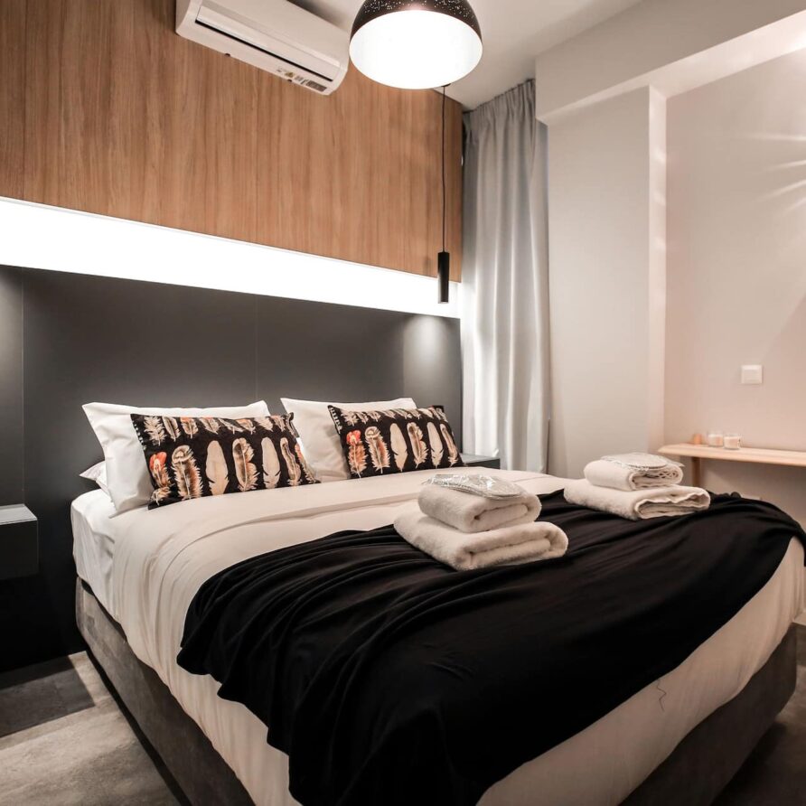 - Amenities: air-conditioning, balcony, bath products, free wi-fi, freezer, hair-dryer, hangers, iron, kettle, laundry, nespresso, oven, self check-in, smart tv, stove tops, towels & linen